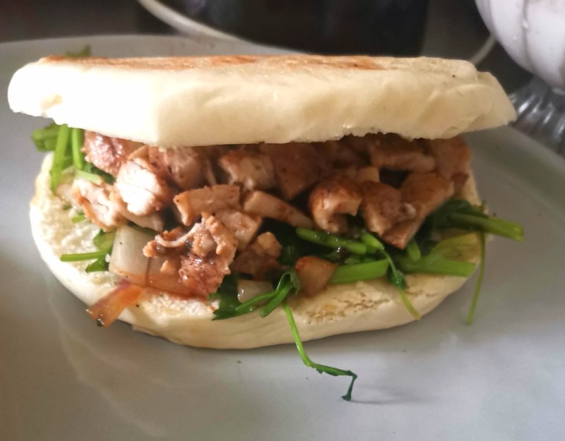 4:把馍从中间割开不割断,放一层生菜色拉。