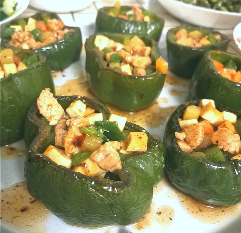10:将炒好的菜丁装入甜椒杯中,平底锅中放油烧热,摆放好甜椒杯,中小火把甜椒杯煎熟。