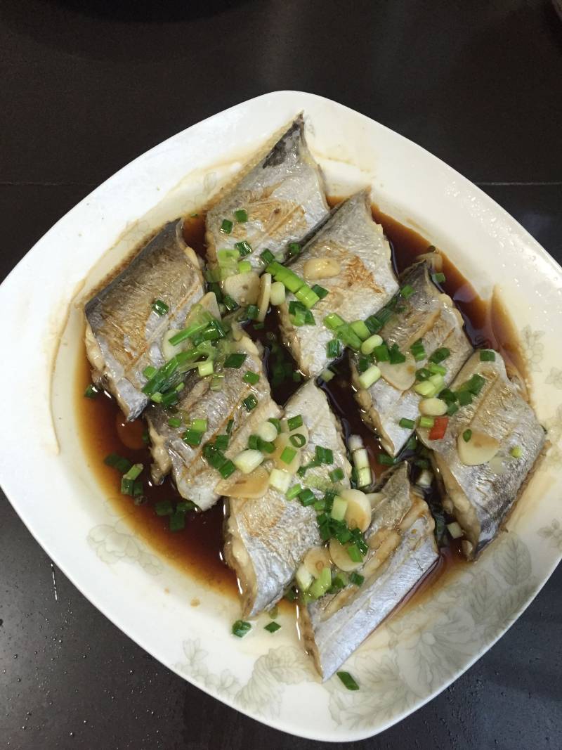 5:将带鱼送入蒸箱中,或者上了热汽的蒸锅里,15分钟左右,看鱼段摞的高度和厚度,以及鱼段的粗细薄厚来调整时间;出锅后可以直接食用,也可以淋少许蒸鱼豉油。