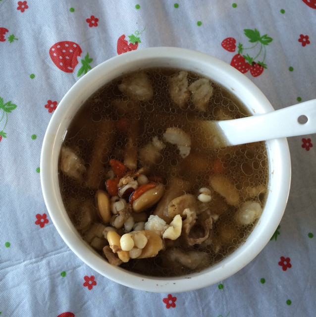 瘦肉100克;薏米6克;扁豆6克;党参6克;枸杞6克;黄芪6克;茯苓6克;芡实6克;