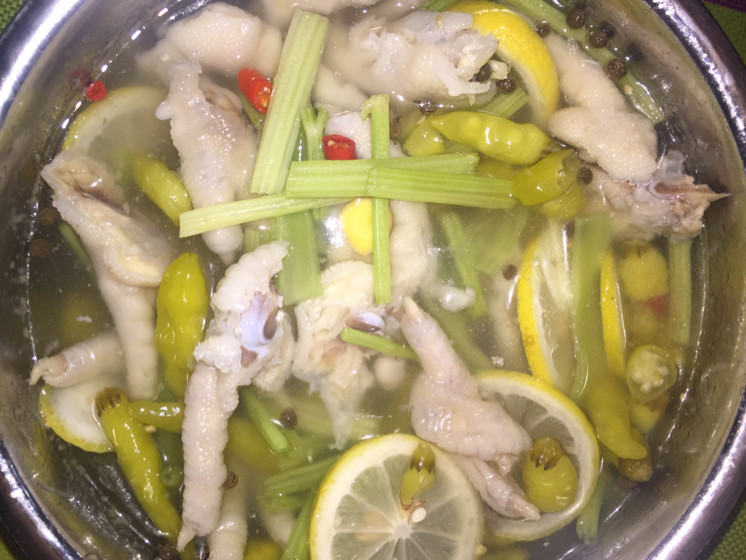 鸡脚500克;泡山椒400克;芹菜100克;姜1块;蒜5个;花椒10棵;小米椒5个;盐10勺;冰糖10棵;柠檬1个;味极鲜5勺;醋10勺;