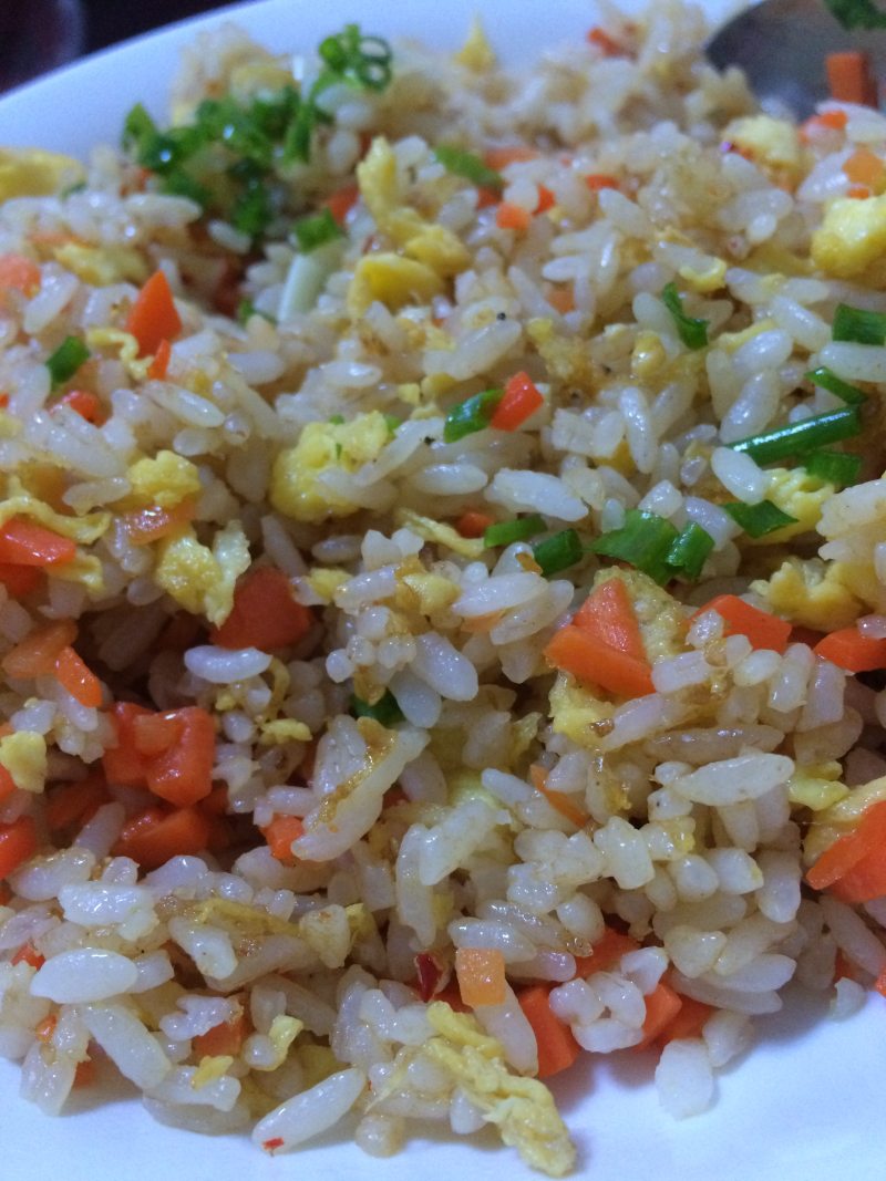 2:下锅,炒好鸡蛋,捞出,在将胡萝卜与虾米放入最后倒入米饭,大火2分钟,后将火慢慢调低(保证米饭粒粒饱满,不会粘锅即可)酱油,盐,鸡精,辣椒粉适量