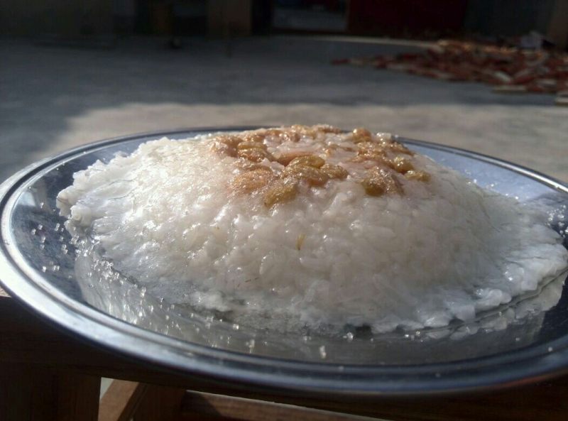 5:蒸好了稍晾凉,将碗倒扣在盘子里,甜饭就完好无损的掉下去到盘子里了(因为之前抹了一层油),然后再上面撒些白糖和蜂蜜,就可以开吃了。我家乡的是这样吃的,至于配料什么的,大家可自由发挥,搭配更好看、更可口点!