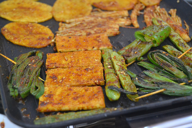 7:烤盘放适量油,把菜放在烧烤盘上,快熟时均匀的抹上烧烤酱即可