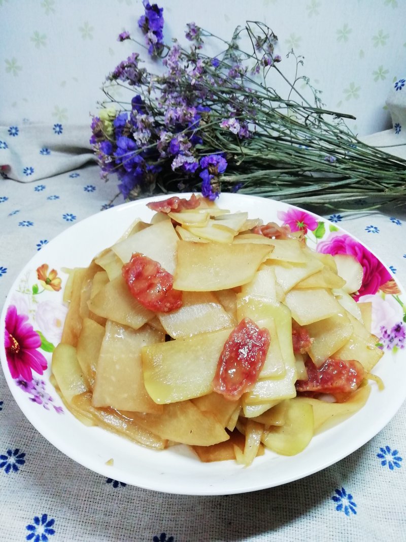 胚兰切片这样炒的比较甘甜,胚兰比较硬,多炒一会儿,炒到变软后加盐,再加腊肠进去炒