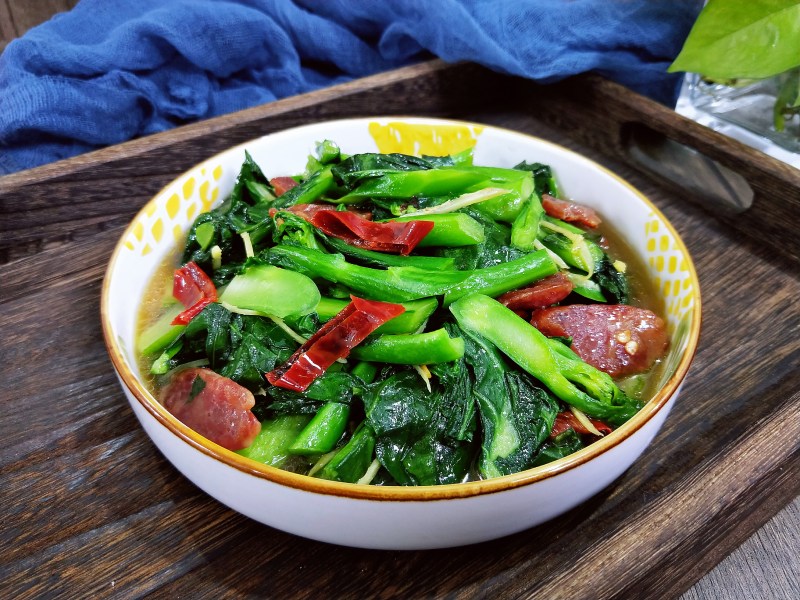 炒腊肠的时候不用放太多盐,因为腊肠会出油。水焯芥蓝的时候要放盐或者醋才能保持芥蓝的青绿色。