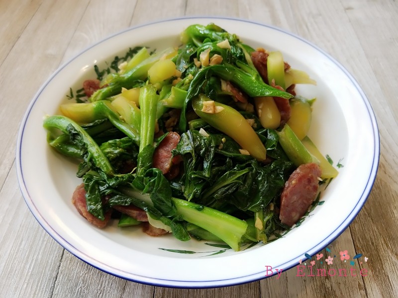 6:热平底锅,下油开始炒芥蓝,大概翻炒5分钟后下大蒜,最后加入已炒好的腊肠,加少许的盐即可。