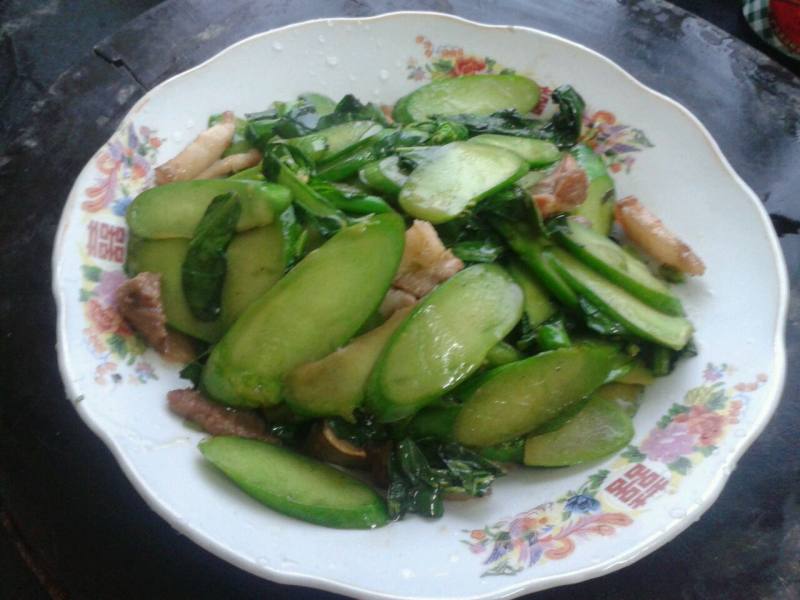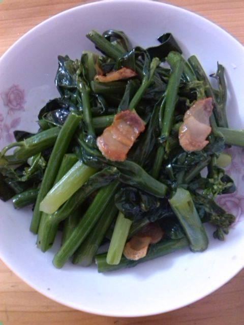 6:腊肉半熟后,大火,将芥蓝倒入锅,炒至香味飘出,即可放盐出锅。