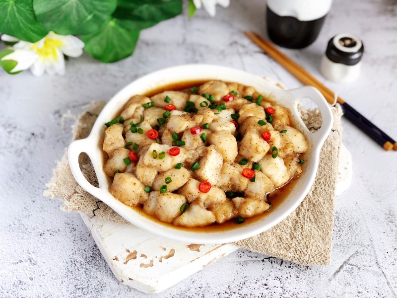 7:出炉,点缀香葱碎和红辣椒,既好吃又好看,鲜嫩入味儿。