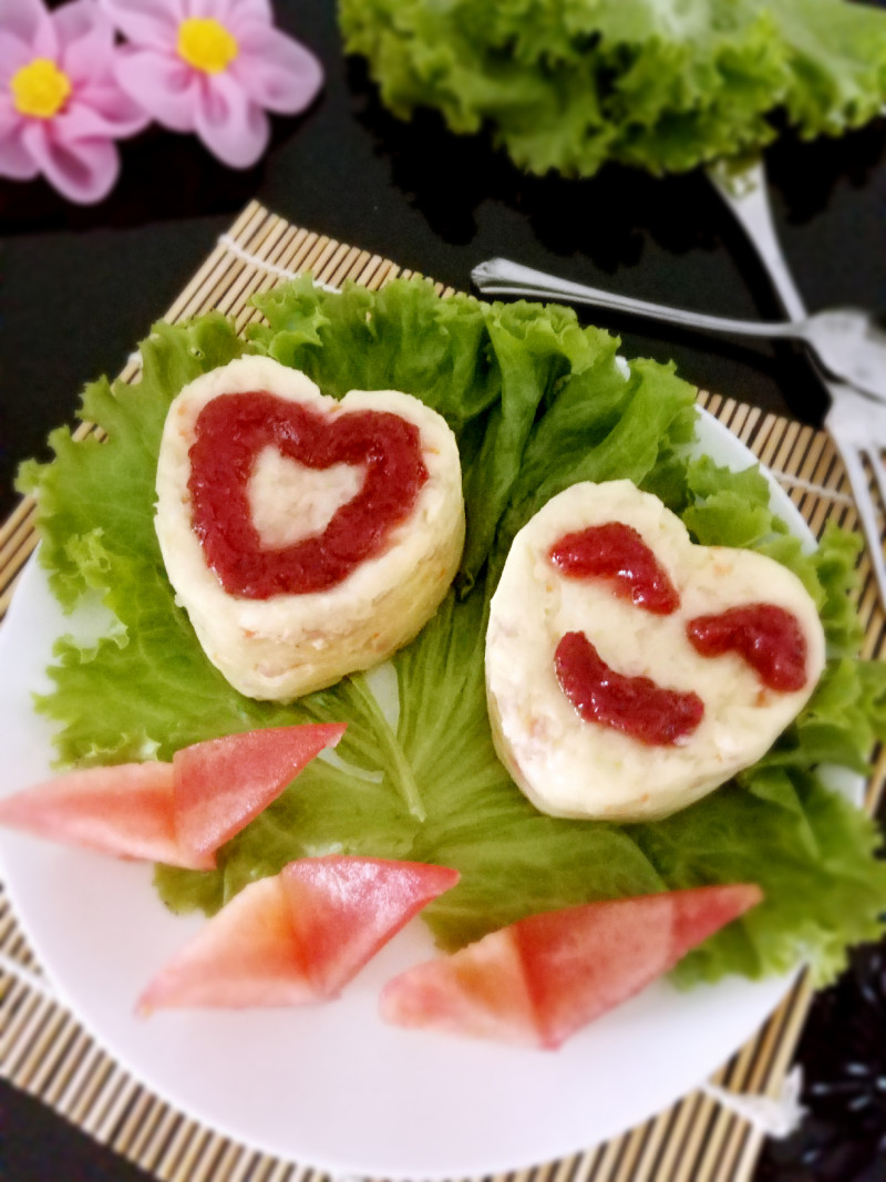 8:盘底放一片生菜,心形模具中放入土豆泥,做成心形。