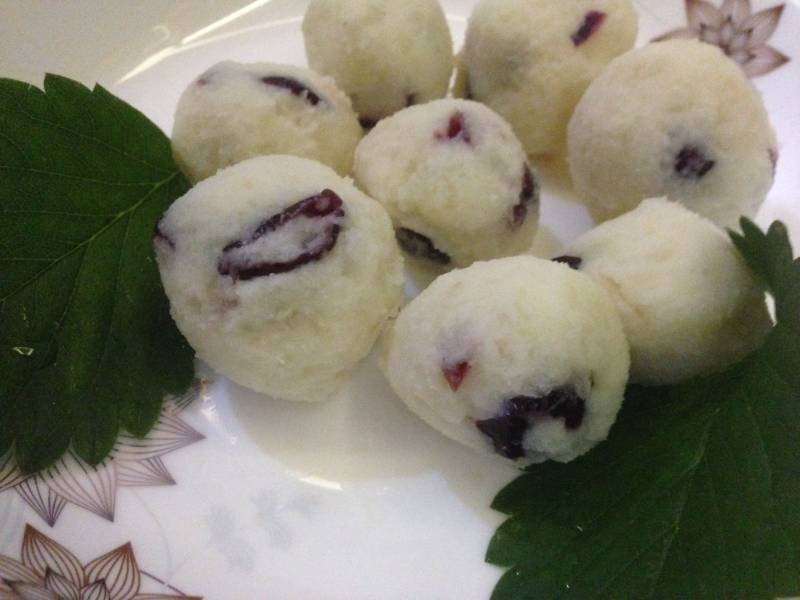 8:将所有的土豆泥装好盘,将番茄酱或是蓝莓酱点在土豆泥球上,装饰。