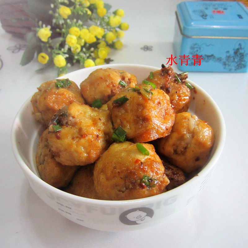 3:将做好的肉馅放到豆腐果里面,做成类似肉馅团子酿,装盘。