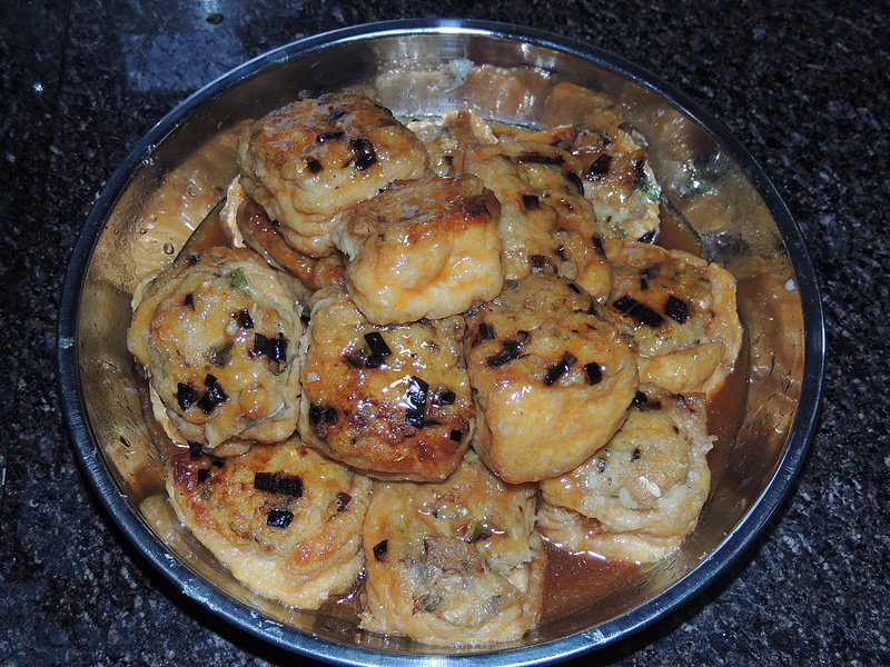 4:锅里加油烧热,然后将酿好的豆腐泡放进去,鱼肉的一面向下,然后煎至鱼肉表面金黄。