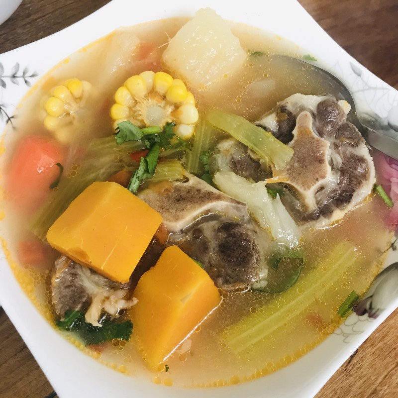 牛尾1条;木薯1根;玉米2根;西芹半棵;土豆2只;南瓜500g;番茄3个;
