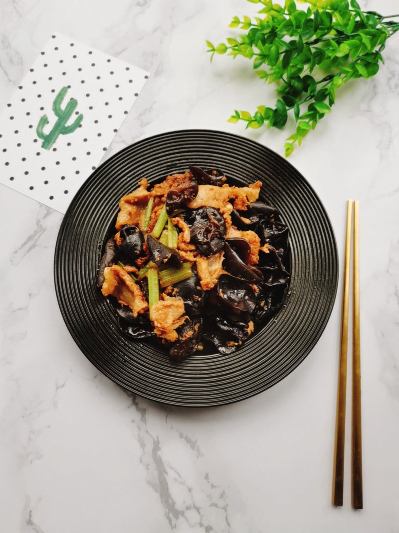 7:肉片变色时拨到一边,放入木耳和芹菜翻炒40秒,和肉片炒匀,加入盐和黄豆酱油炒匀即可。