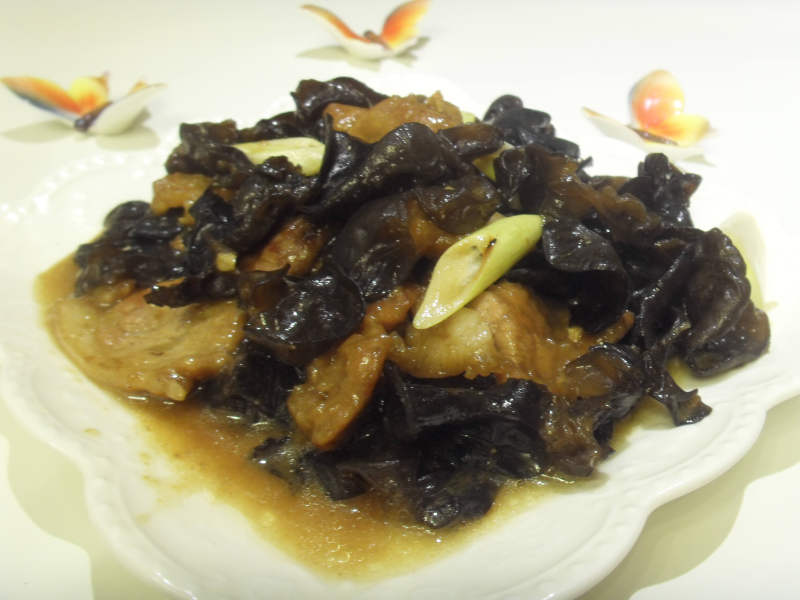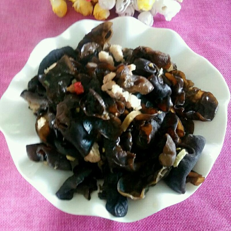2:锅内加油烧热,滑入猪肉片煸炒至发白后,依次加入葱姜末、十三香翻炒出香味后,倒入木耳翻炒几下,加盐适量,加水半碗;