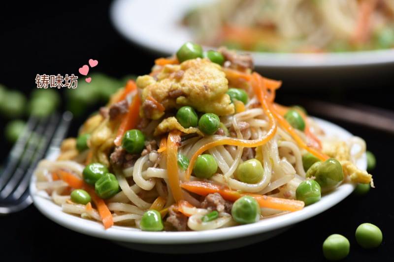 8:下豌豆、红萝卜丝翻炒(转大火翻炒防止出水)