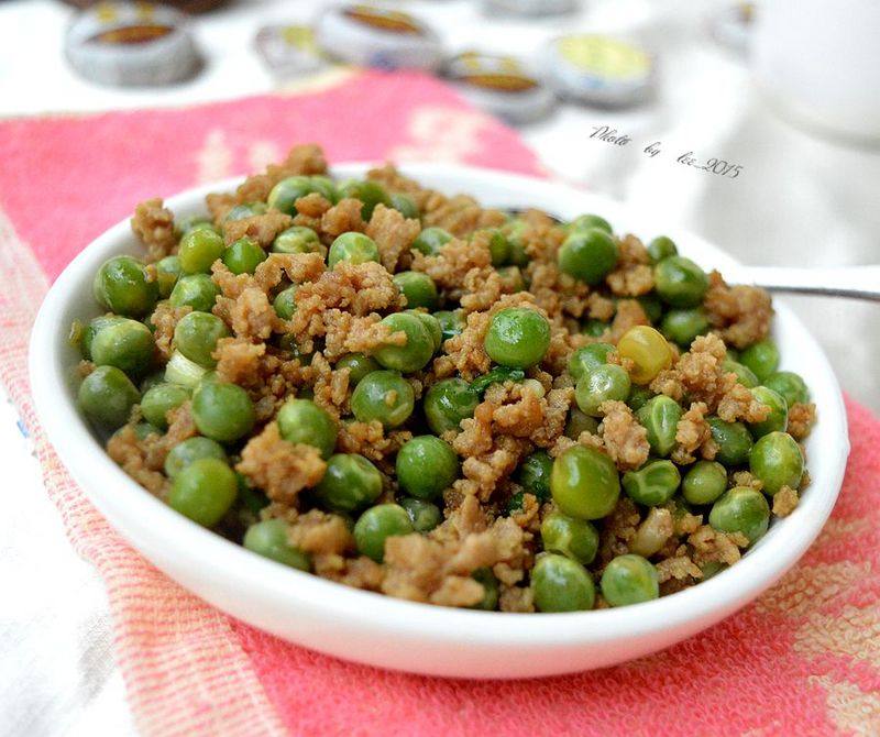 5:肉末炒至微黄色后加进豌豆翻炒一分钟左右。