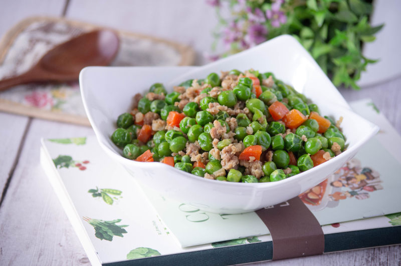 4:之前准备好的豌豆和胡萝卜一起下锅。