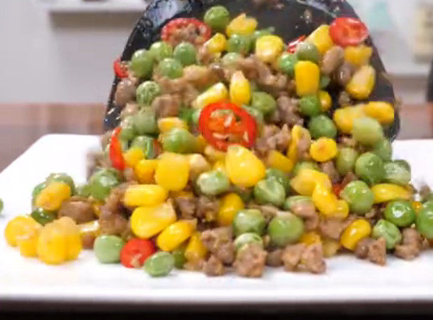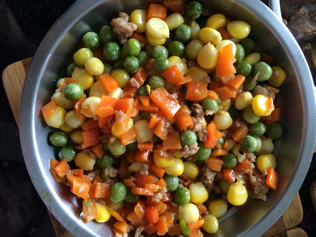 3:把蒸熟的玉米豌豆胡萝卜倒入猪肉末一起炒!