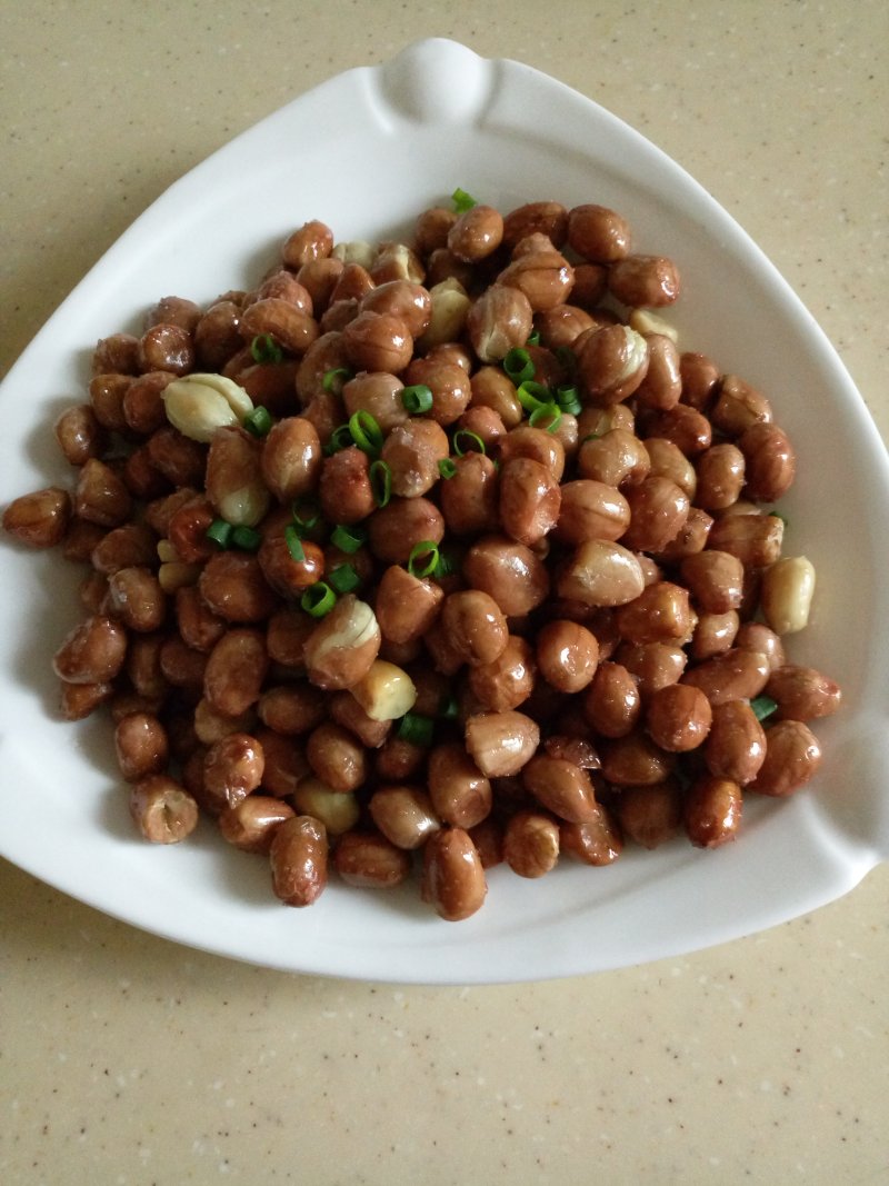 5:酥脆五香花生米捞出装盘,角度与灯光不同拍出的效果不同,实际颜色(如上图锅中捞出颜色正)一样恰到好处,晾晾后被家人一品而光、口感特别酥脆、口味微甜、微咸、脆香。