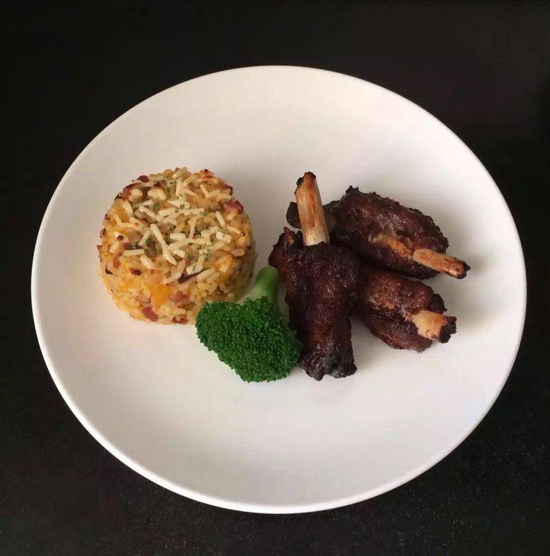 1:叉烧酱黑胡椒蒜泥盐酱油橄榄油什锦草腌制排骨,200度烤30-40分钟根据情况盖锡纸