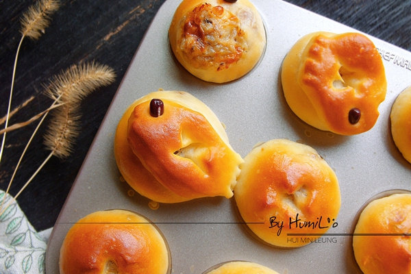 1.面包水量请根据自己面粉的吸水性调整2.馅料加得越多越好吃,芝士加得多容易爆出来,发酵前剪口比较平整,发酵后剪口也可以3.烤的温度时间根据烤箱以及模具的不同作调整