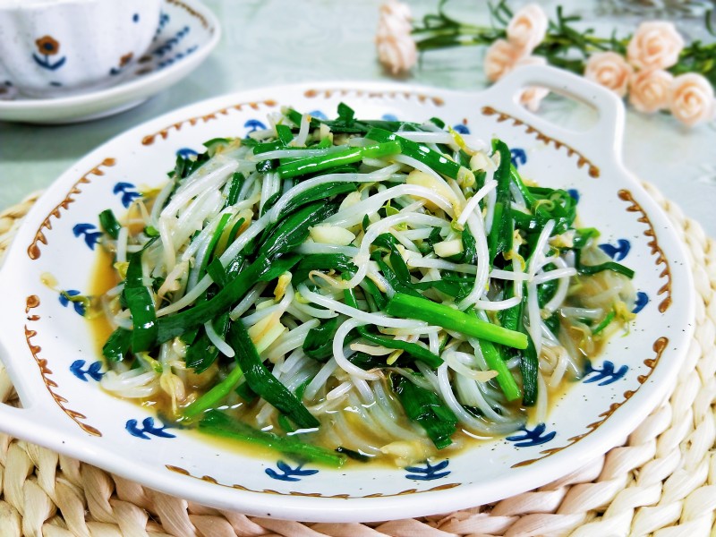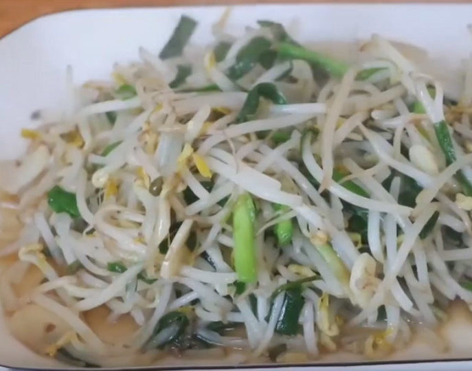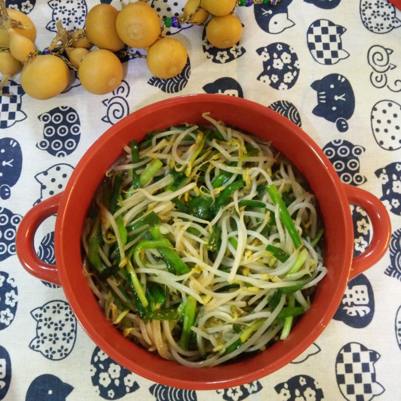 5:韭菜断生后加入豆芽翻炒均匀,加入盐,鸡精,酱油炒熟即可。