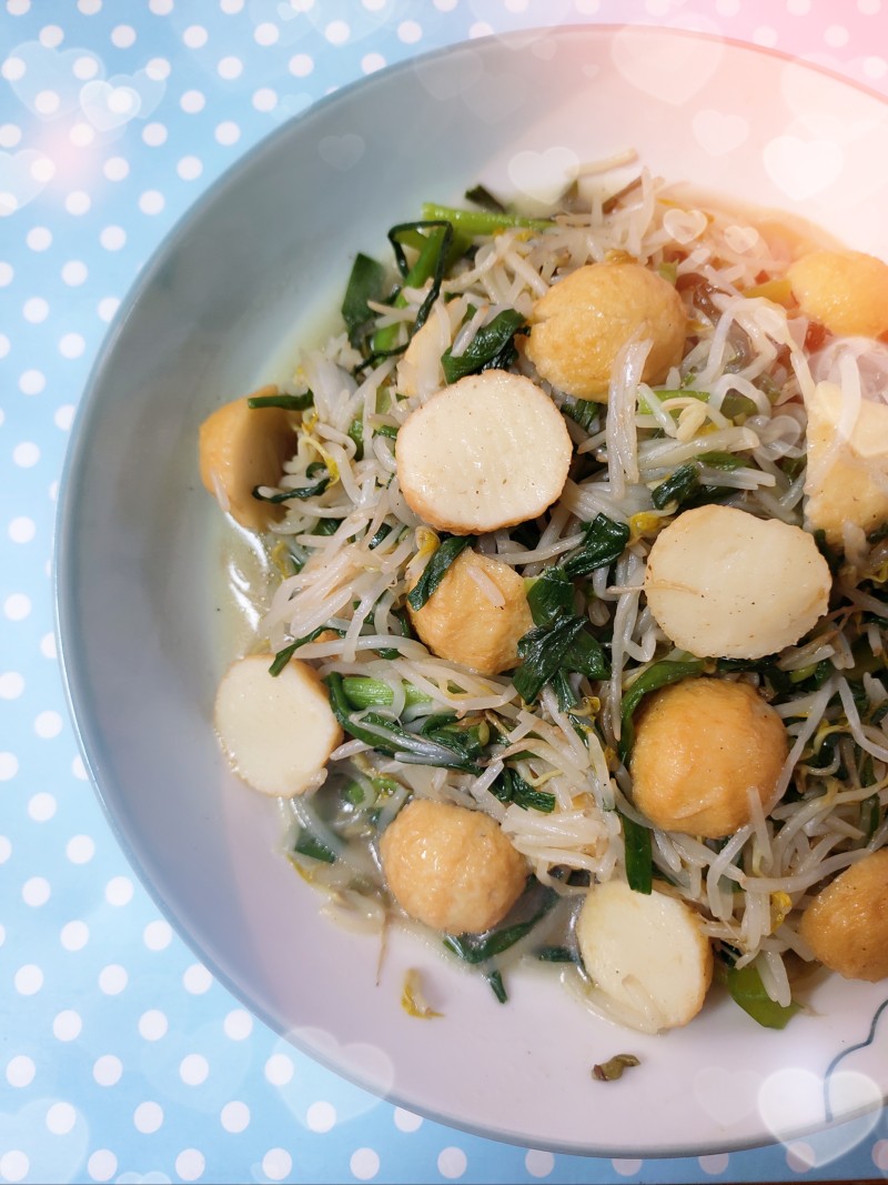 4:锅中倒入少许油,下鱼丸煸炒一下。