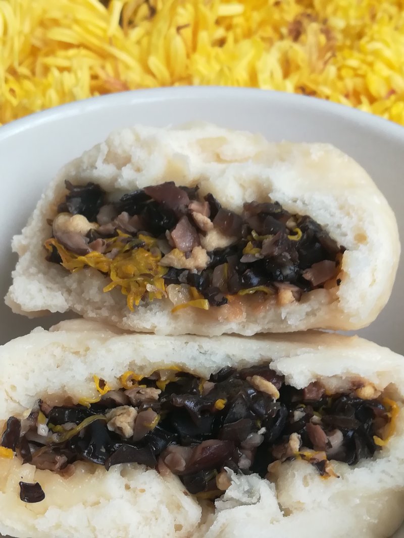 发酵面团800克;菊花200克;香菇100克;黑木耳100克;鸡蛋两颗;