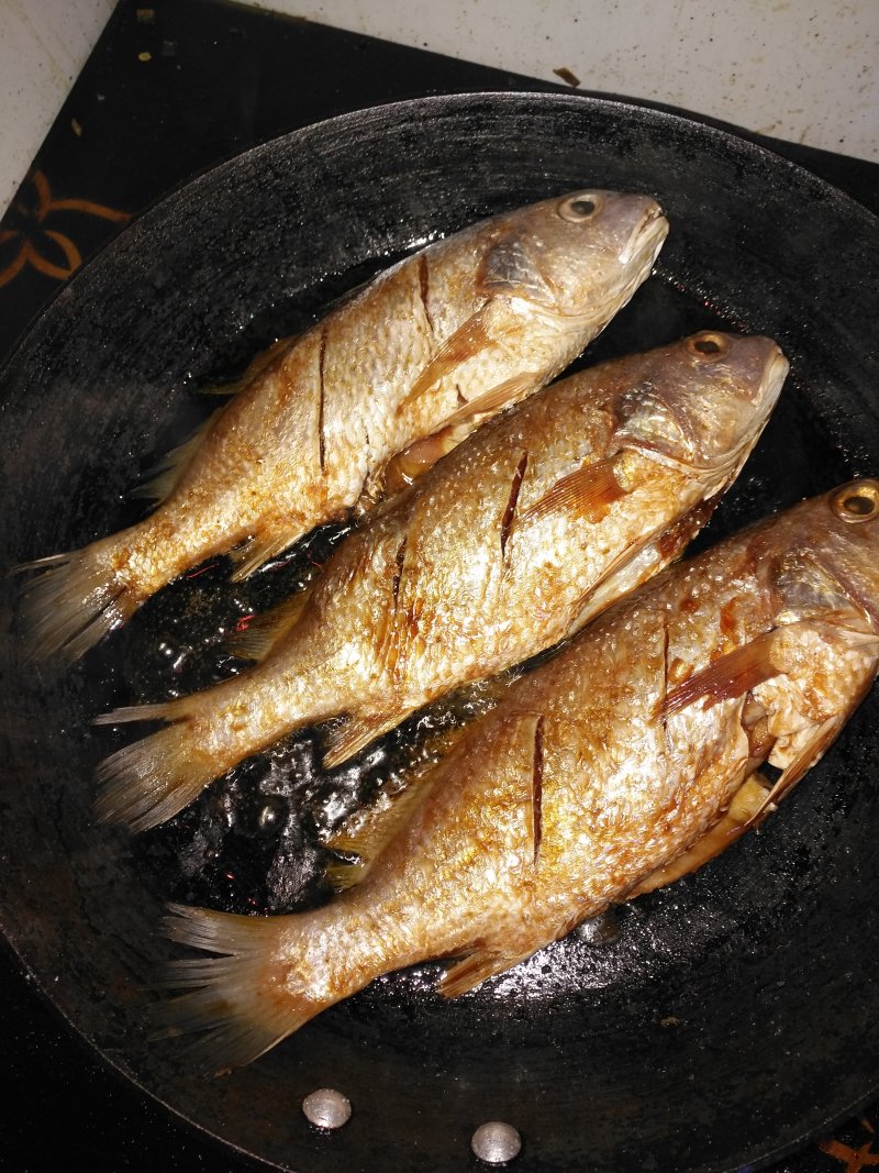 5:锅中放适量的油,五成热把鱼放下去煎炸(比炒菜多比炸又少一点,随意吧)