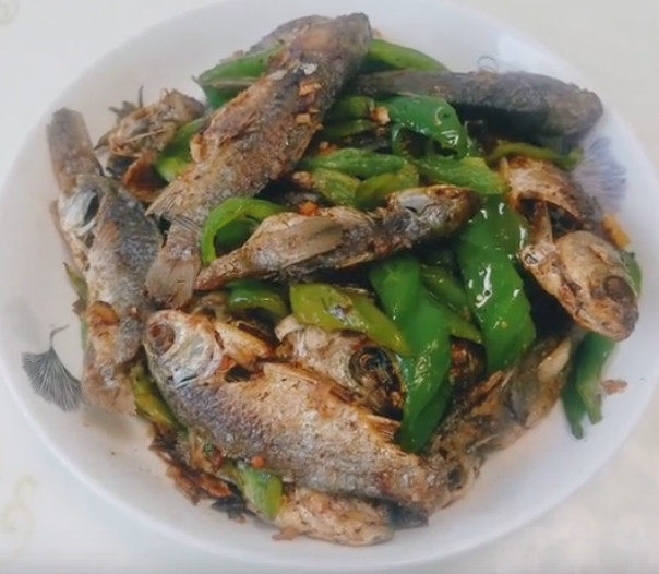 5:青椒断生后倒入鲫鱼翻炒一下,加入酱油,少许盐炒匀即可。