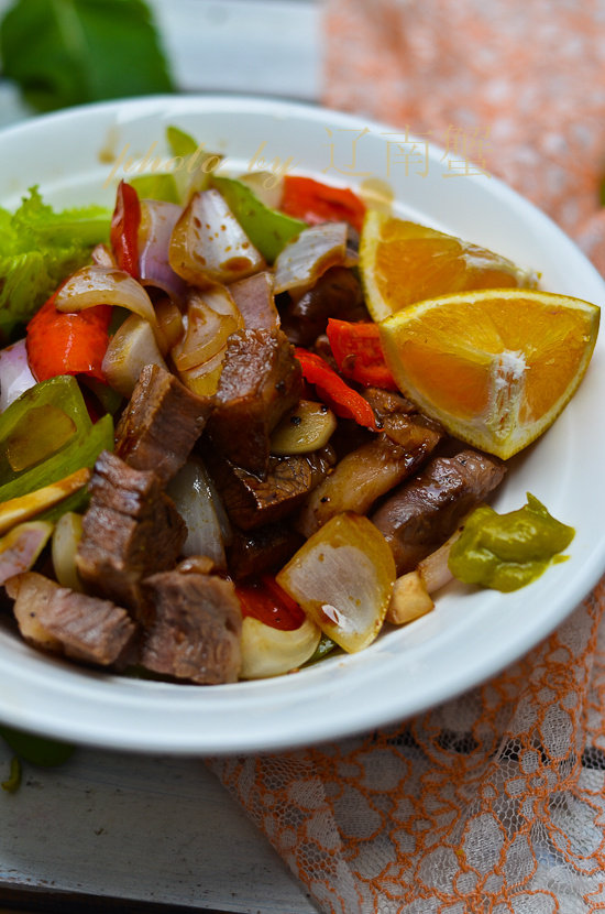 12:将之前煎好的蔬菜跟牛排拌一起,装盘,摆上橙子和生菜,挤上芥茉膏,浇上煮好的酱油汁,可以开吃了。