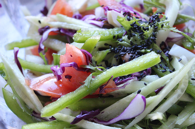 1:将青菜用盐水浸泡洗净。黄瓜、紫甘蓝、青椒、洋葱切丝,西红柿切小块,苦苣切段放入搅拌碗中。