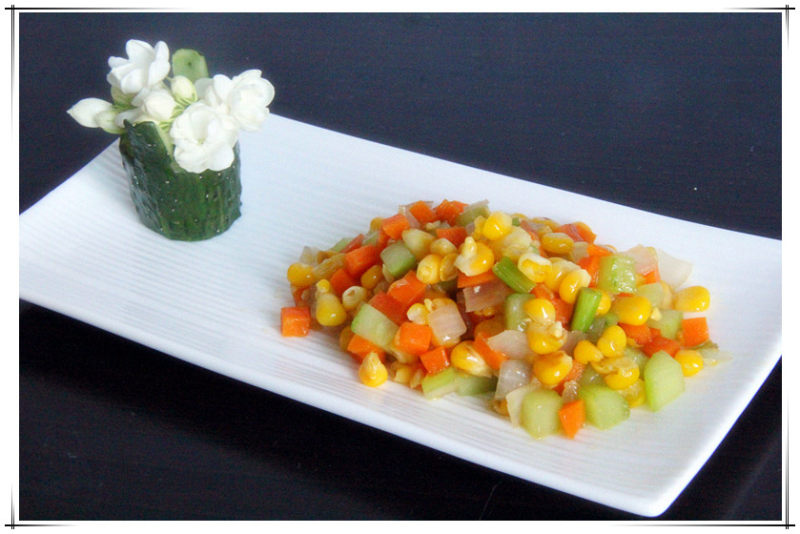 胡萝卜较硬,早点入锅炒;而玉米和黄瓜可晚些时候入锅,保持营养哦~~~