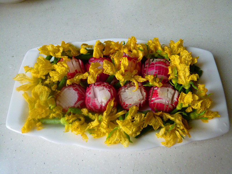 樱桃萝卜适量;新鲜黄瓜花适量;