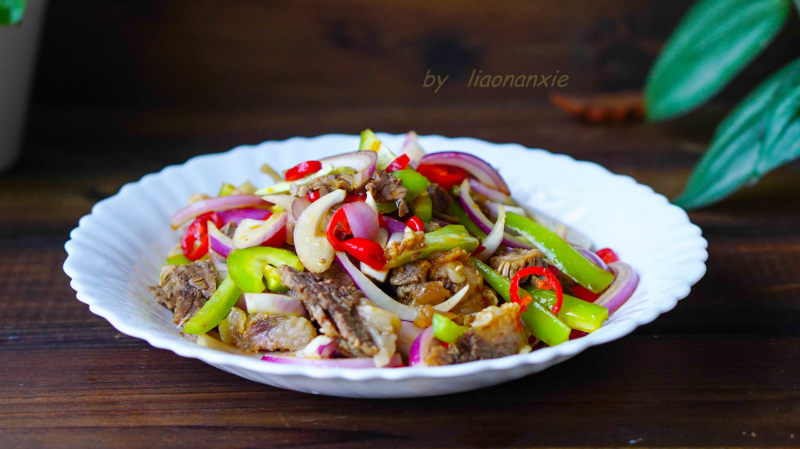 8:切好的蔬菜和牛肉放在大碗中,加生抽,加盐,加辣椒油,加芝麻油,拌均匀就可以开吃了,香且不腻,令人胃口大开。