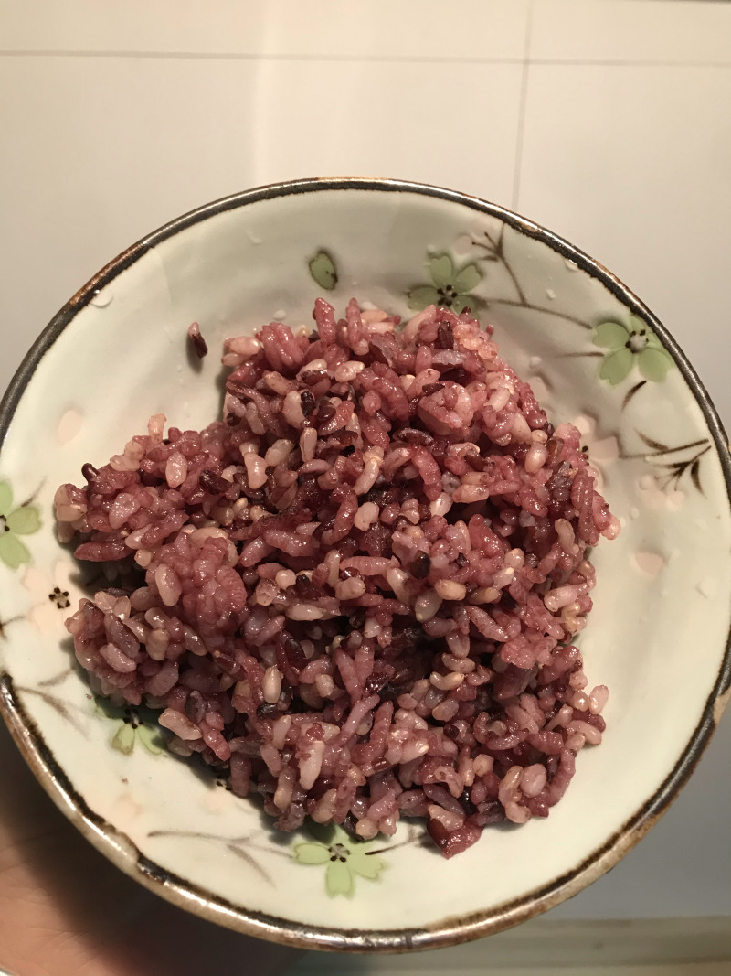 1:三色糙米淘洗,浸泡2小时后煮熟,米和水的比例1:1.5左右。