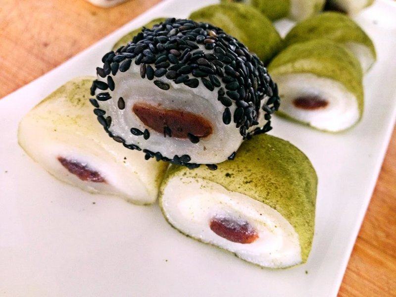 13:卷起来,切段。可以按照个人口味在面皮外面裹上抹茶粉、黑芝麻等。