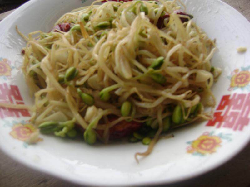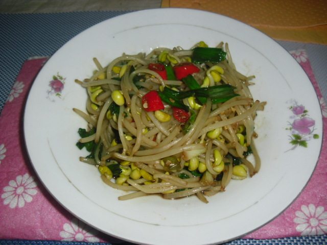 5:加红辣椒丝煸炒出香味价黄豆芽。