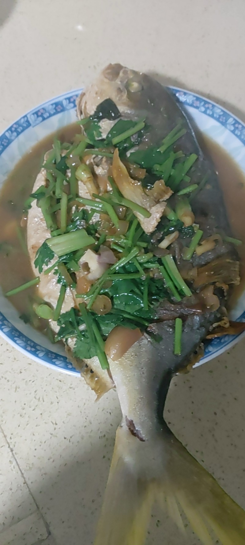 10:将鲳鱼铲入盘中,剩下的汤收收汁变浓稠,淋在鱼身上即可。