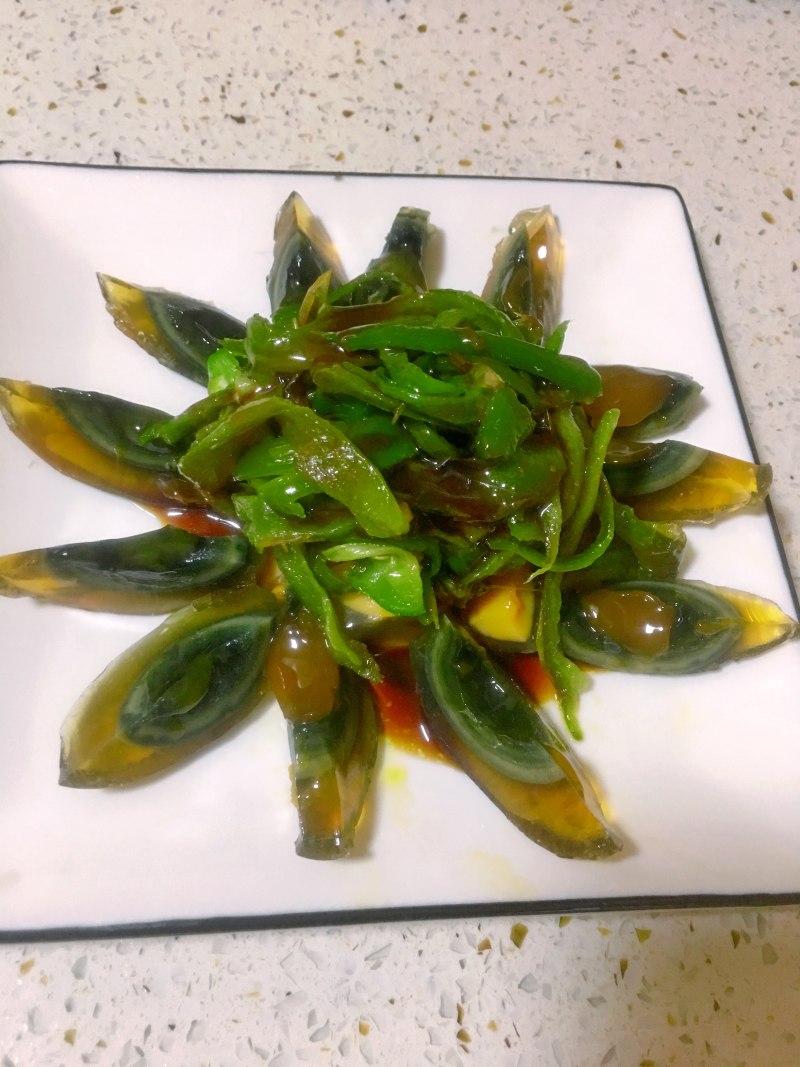 4:放入青椒和皮蛋,一起放入,青椒才能入皮蛋味