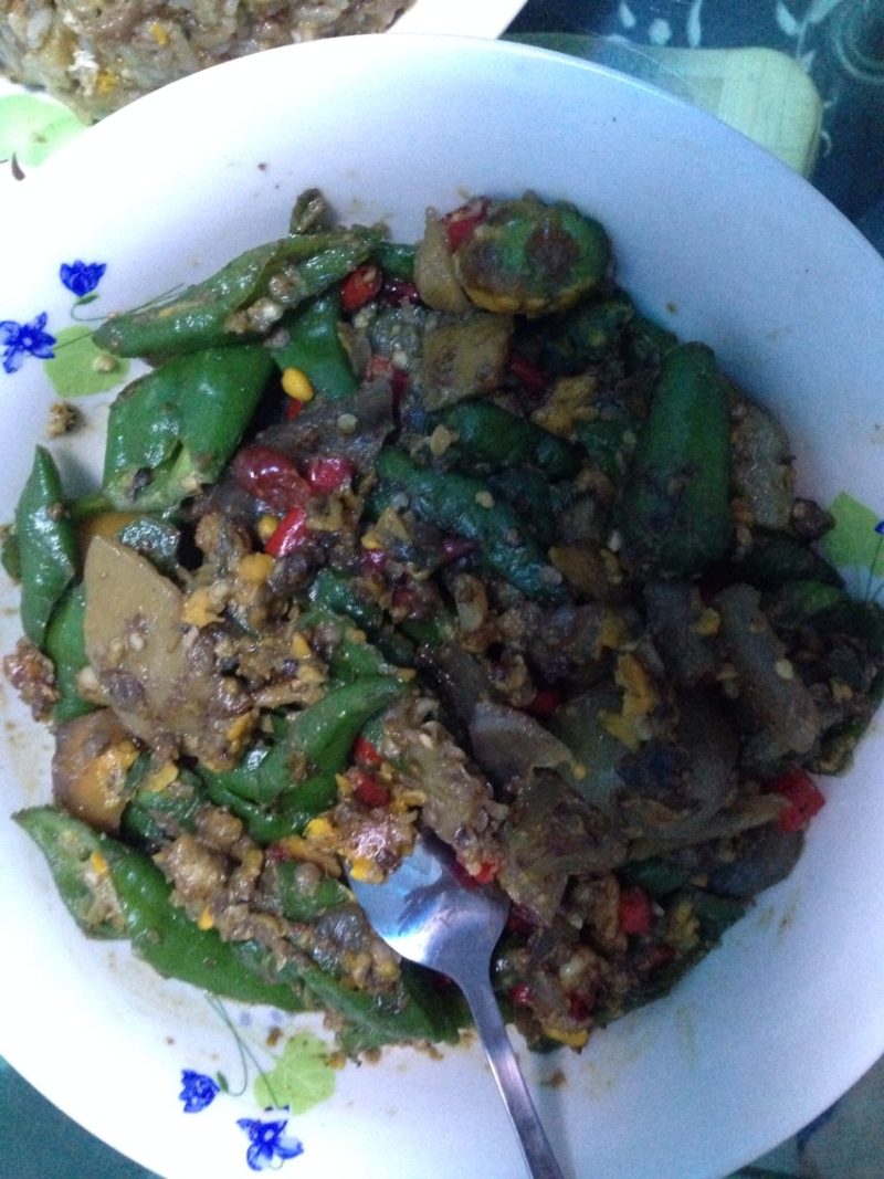 4:待香味散出,放入青椒和皮蛋,一起放进入,皮蛋的味儿才能入青椒!