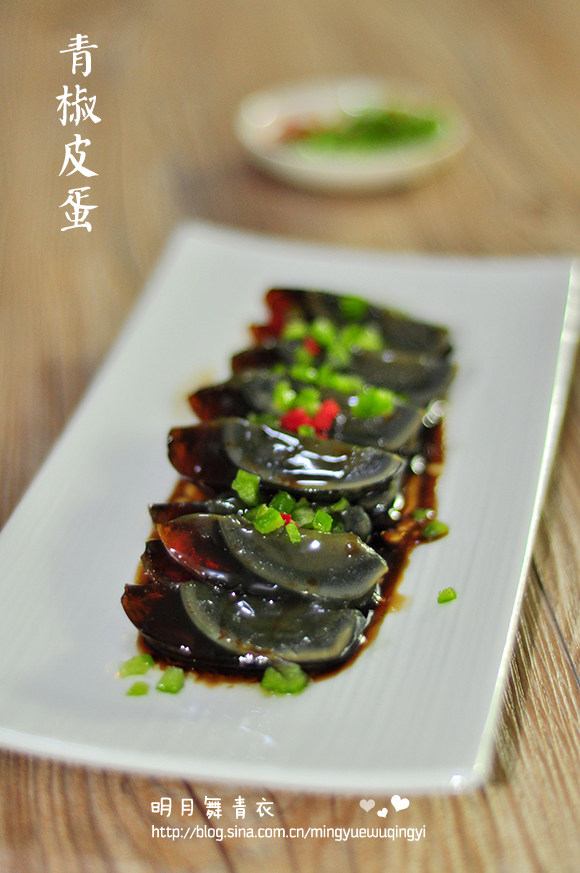 5:皮蛋装盘后,淋上调味汁,撒上青红椒碎。