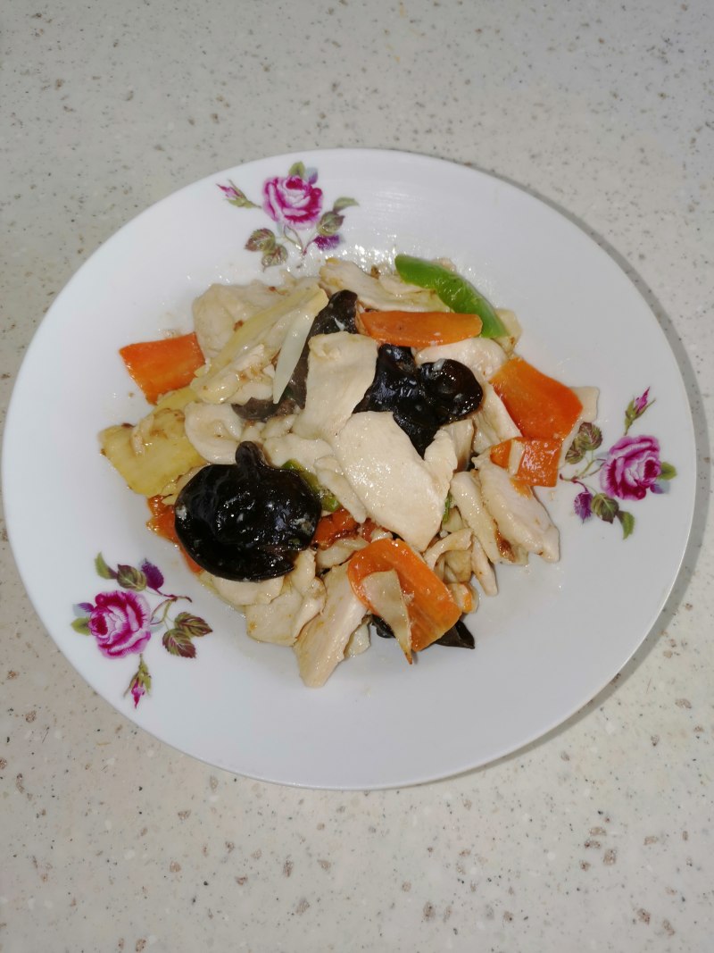2:鸡胸切片,放盐,料酒,淀粉腌10分钟,冬笋,胡萝卜切片,木耳泡发。