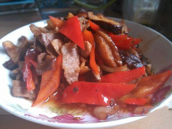 8:香菇炒软后放入肉和红椒,继续炒