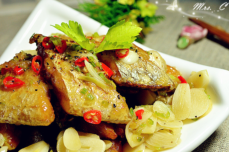9:将炒好的蒜蓉、火麻仁撒在做好的带鱼上并放红椒粒和葱花添色增香。