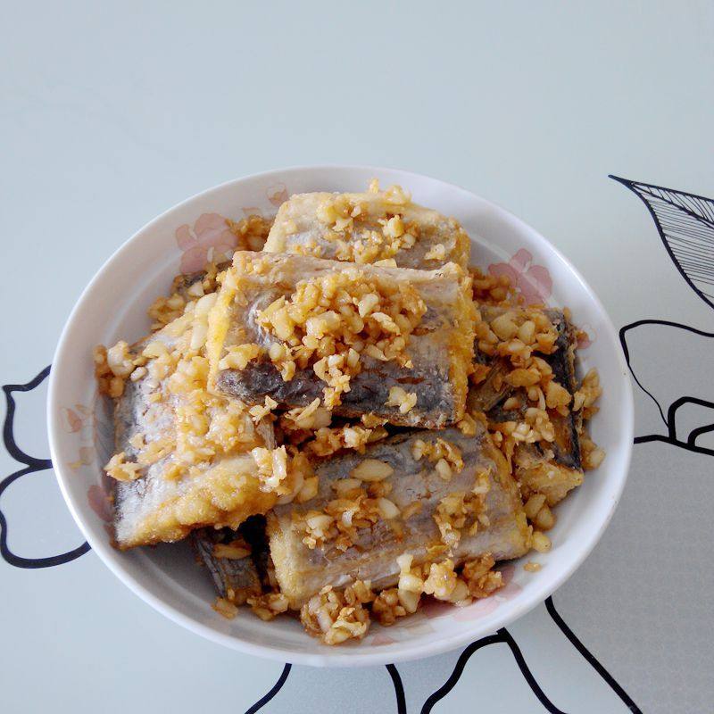 6:放入带鱼,炸至双面金黄色,最后再将蒜蓉也放入炸一下,再撒在带鱼上面。
