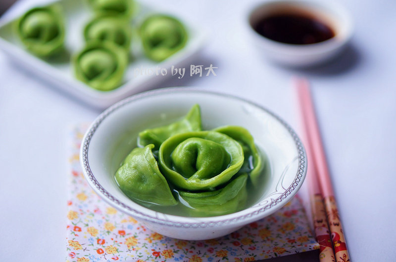 菠菜汁接近面粉一半的量,做饺子面团尽量和干一点!