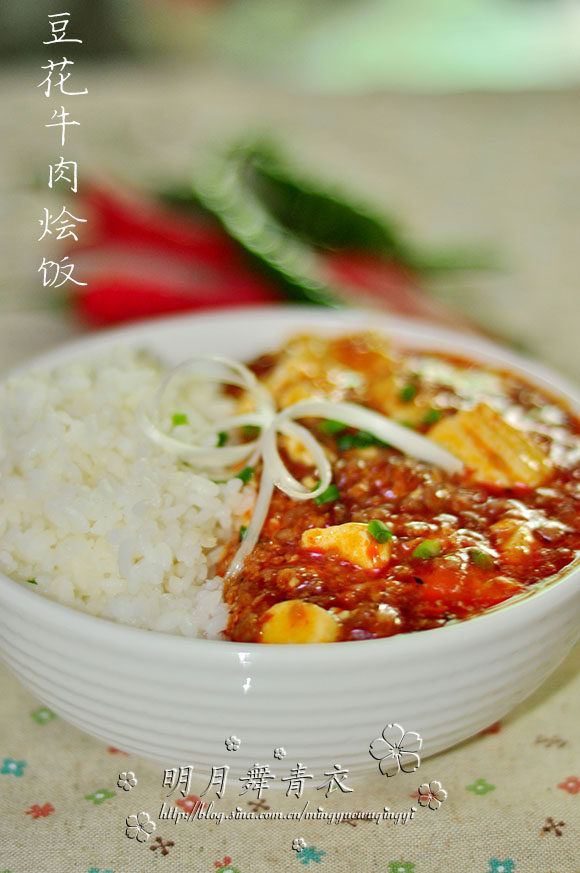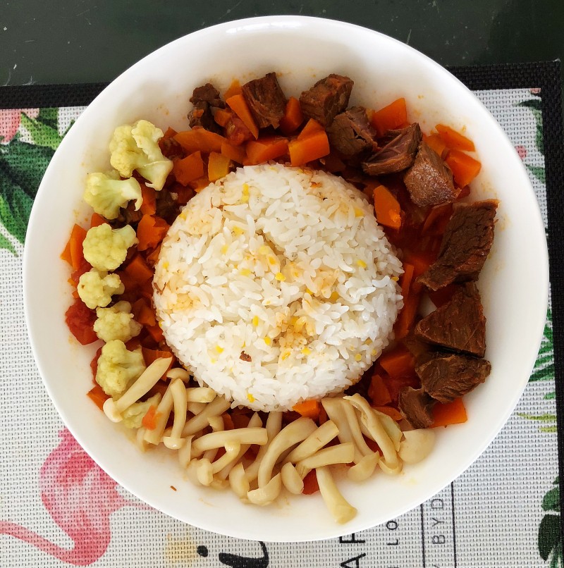 4:饭倒扣入盘中,舀取炖好的牛肉胡萝卜,摆入烫过水的花菜和海鲜菇即可。